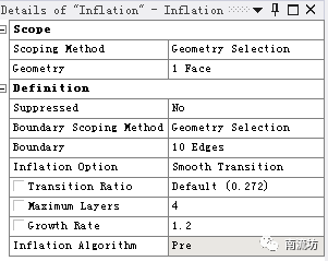 (3)右键单击模型树中Mesh选项,依次选择Mesh→Insert→Inflation。boundary选择管道壁面,在Maximum Layers中输入4。