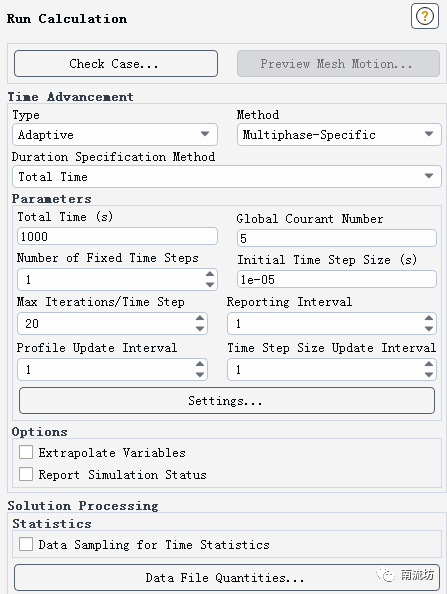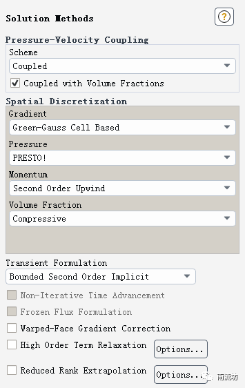 (1)单击主菜单中Solution→Methods按钮,弹出Solution Methods面板。Pressure-Velocity Coupling中,Scheme选择Coupled,勾选Coupled with Volume Fractions。