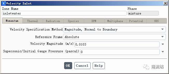 (3)在边界条件面板中,双击inletwater弹出边界条件设置对话框。Velocity Magnitude输入0.0103,单击OK按钮确认退出。
