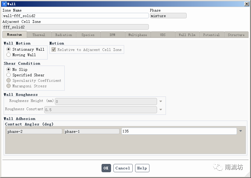 (4)在边界条件面板中,双击wall弹出边界条件设置对话框。Contact Angles输入135,单击OK按钮确认退出。