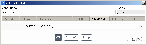 Phase选择Phase-2,在Multiphase选项卡中Volume Fraction填入1,单击OK按钮确认退出。
