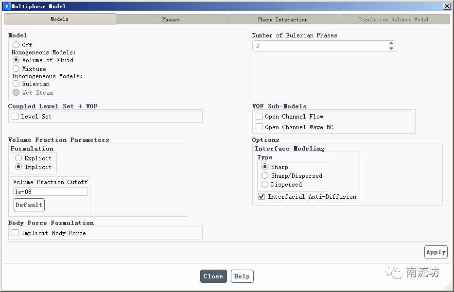 (2)在模型设定面板Models中双击Multiphase按钮,弹出Multiphase Model(多相流模型)对话框,选择VOF,勾选Interfacila Anti-Diffusion。