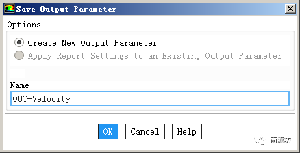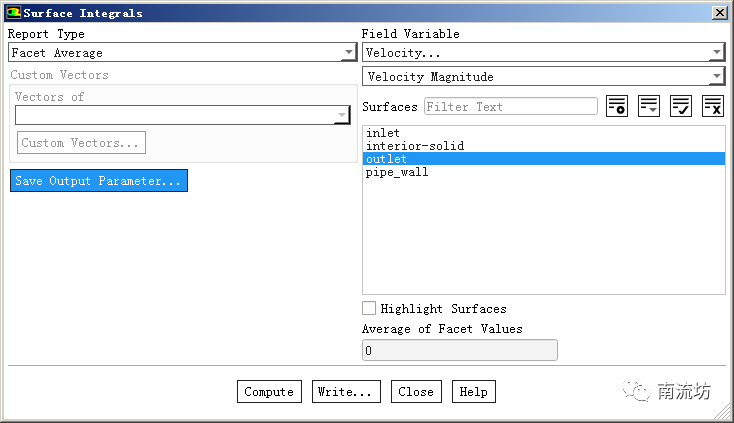 (2)计算完成后,单击主菜单中Postprocessing→Reports→Surface Integrals按钮,Report Type选择Face Average,Field Variable选择Velocity,Surface选择outlet,单击Save Output Parameter,Name设置为OUT-Velocity。