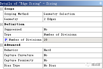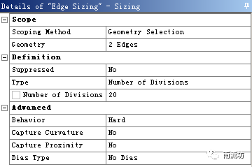 (3)右键单击模型树中Mesh选项,依次选择Mesh→Insert→Sizing。Geometry选择管道进出口边缘,Type选择Number of Divisions,在Number of Divisions中输入20。