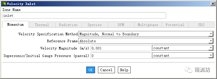 (2)在边界条件面板中,双击inlet弹出边界条件设置对话框。Velocity Magnitude输入0.001,单击OK按钮确认退出。