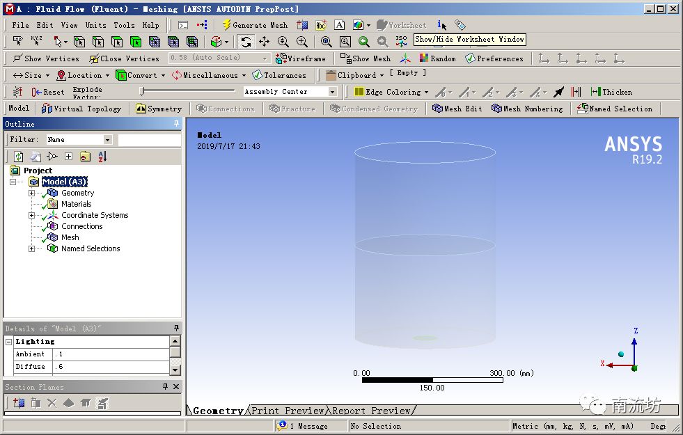 (1)双击A3栏Mesh项,进入Meshing界面,在该界面下进行模型的网格划分。