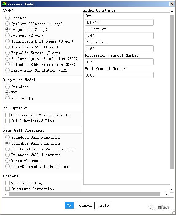 (3)在模型设定面板Models中双击Viscous按钮,弹出Viscous Model(湍流模型)对话框,在Model中选择RNG k-epsilon(2eqn),在Near-Wall Treatment中选择Scalable Wall Functions,单击OK按钮确认并关闭对话框。