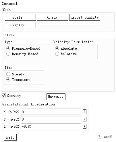 (1)单击命令结构树中General按钮,弹出General(总体模型设定)面板。在SolverTime中选择Transient,勾选Gravity,在Z中填入-9.81m/s2。