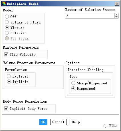 (4)在模型设定面板Models中双击Multiphase按钮,弹出Multiphase Model(多相流模型)对话框,选择Mixture,Number of Eulerian Phases填入3,单击OK按钮确认并关闭对话框。