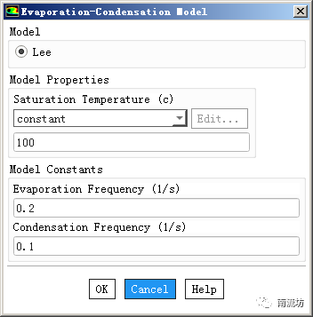 (6)在Phase设定对话框中,双击Interaction按钮,弹出Phase Interaction对话框,在Mass选项卡中,Number of Mass Transfer Mechanisms选择1,在Mechanism中选择evaporation-condensation,单击Edit按钮进入evaporation-condensation model对话框,Saturation Temperature填入100,Evaporation Frequency填入0.2,Condensation Frequency填入0.1,单击OK按钮确认。