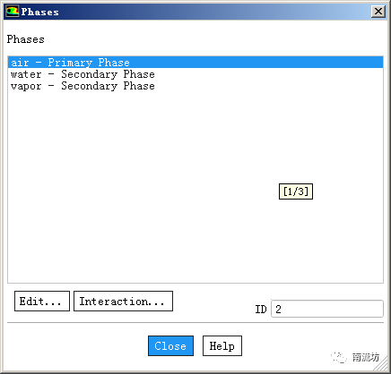 (5)在模型设定面板Models中双击Multiphase下的Phases按钮,弹出Phase(多相流设置)对话框,在Phase-1对话框中,Phase Material选择air,在Phase-2对话框中,Phase Material选择water-liquid和water-vapor,单击OK按钮确认并关闭对话框。