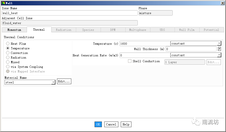 (2)在边界条件面板中,双击鼠标左键选择wall_heat,弹出边界条件设置对话框。在Thermal选项卡中,Thermal Condition选择Temperature,Temperature输入1600,Material Name选择Steel,单击OK按钮确认退出。