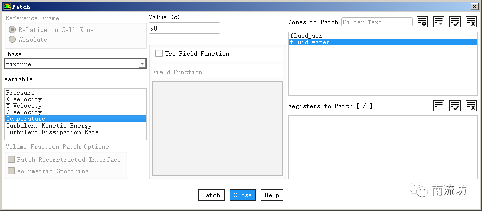 (2)在Solution Initialization(初始化设置)面板中,单击Patch按钮,弹出Patch对话框,在Zone to Patch中选择fluid_water,Variable中选择Temperature,在Value中填入90,单击Patch按钮。