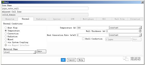 (4)双击设置pipe_outer_wall,在Thermal选项卡中,Thermal Condition选择Temperature,Temperature中填入300,Material Name选择Steel。