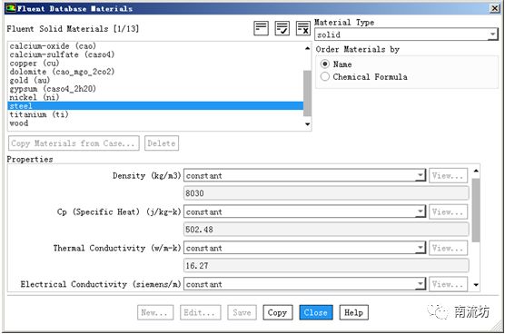 (1)单击主菜单中Setting Up Physics→Materials→Create/Edit,弹出Create/Edit Materials(材料)对话框。单击Fluent Database按钮弹出Fluent Database Materials对话框,选择water liquid单击Copy按钮确认。