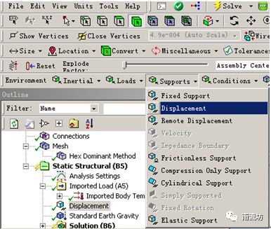 (8)在工具栏单击Supports->Displacement,选择固体域中三个出入口的端面,设置位移为0。
