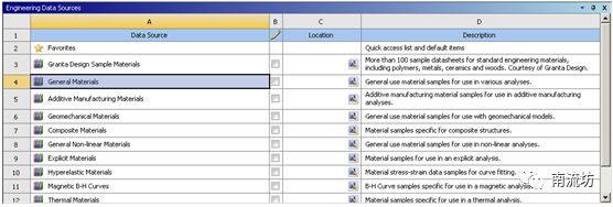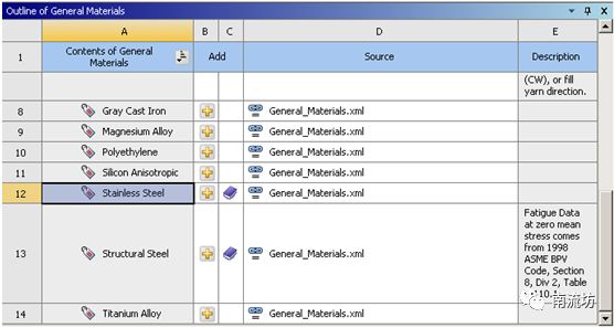 (2)在Outline of Schematic B2:Engineering Data窗口中,右键空白处选择Engineering Data Sources按钮,弹出的“ Engineering Data Sources”窗口,单击鼠标左键选择General Materials,在Outline of General Materials窗口中,选择Stainless Steel单击右侧的“+”号。