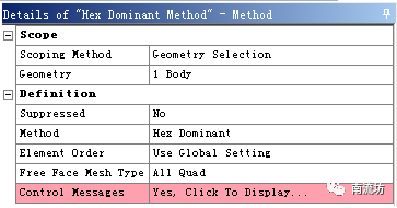 (4)右键单击模型树中Mesh选项,依次选择Mesh→Insert→Method,Method选择Hex Domainant,Free Face Mesh Type选择All Quad。