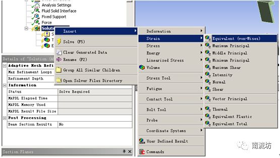 (10)右键选择Solution,分别单击Insert->Deformation->Total和Insert->Strain->Equivalent作为计算输出变量。