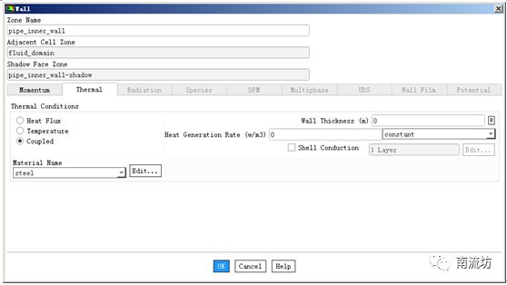 (3)双击设置pipe_inner_wall,在Thermal选项卡中,Thermal Condition选择Coupled,Material Name选择Steel。