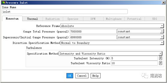 (1)在边界条件面板中,单击inlet,Type选择pressure-inlet,单击Edit按钮弹出边界条件设置对话框,Gauge Total Pressure输入7000000,Supersonic/Initial Gauge Pressure输入6990000。