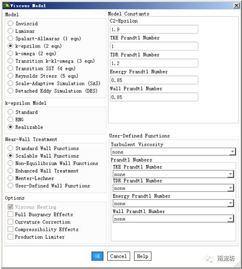 (4)在模型设定面板Models中双击Viscous按钮,弹出Viscous Model(湍流模型)对话框,在Model中选择Realizable k-epsilon(2eqn),在Near-Wall Treatment中选择Scalable Wall Functions,单击OK按钮确认并关闭对话框。