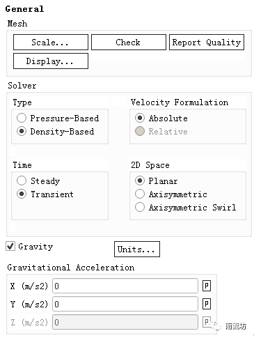 (2)单击命令结构树中General按钮,弹出General(总体模型设定)面板。在SolverTime中选择Transient,在Type中选择Density-Based。