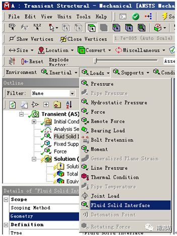 (3)同时选择fluid-structure和Fluid Solid Interface,右键单击Create Data Transfer按钮,创建流固数据链接。