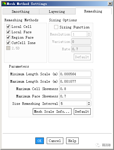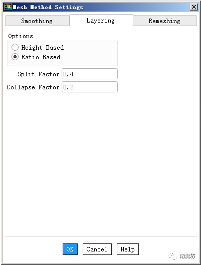 (1)单击主菜单中Setting Up Domain→Mesh Models→Dynamic Mesh按钮启动的Dynamic Mesh对话框,选择Smoothing,Layering和Remeshing,单击Settings按钮弹出Mesh Method Settings对话框。