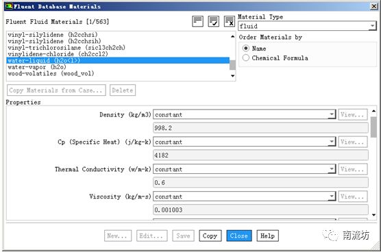 (1)单击主菜单中Setting Up Physics→Materials→Create/Edit,弹出Create/Edit Materials(材料)对话框。单击Fluent Database按钮弹出Fluent Database Materials对话框,选择water liquid单击Copy按钮确认。