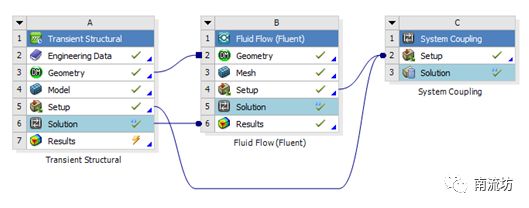 (2)分别双击主界面Toolbox(工具箱)中的Analysis systems→Transient Structural,Analysis systems→Fluid Flow(Fluent)和Component systems→System Coupling选项,即可在项目管理区创建分析项目A(固体),项目B(流体)和项目C(耦合计算),将项目A的几何数据(A3)传递给项目B(B2),将项目A的结果数据(A6)传递给项目B(B6),将项目A的计算设置数据(A5)和项目B(B4)的计算设置数据都传递给项目C(C2)。