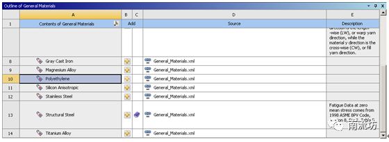 (2)在Outline of Schematic A2:Engineering Data窗口中,右键空白处选择Engineering Data Sources按钮,弹出的“ Engineering Data Sources”窗口,单击鼠标左键选择General Materials,在Outline of General Materials窗口中,选择Polyethylene单击右侧的“+”号。
