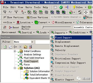 (7)在工具栏单击Supports->Fix Support,选择固体域中两个固定的端面。