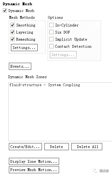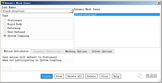 (2)在Dynamic Mesh对话框中,单击Create/Edit按钮,打开Dynamic Mesh Zones对话框,在Zones Names中选择fluid-structure,Type选择System Coupling,单击Create按钮。