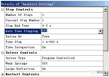 (5)单击选择Analysis Settings,Step End Time中填入0.5s,Auto Time Stepping选择Off,Time Step填入1e-3。
