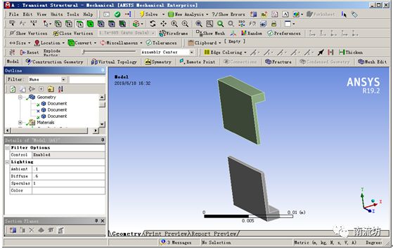 (1)双击A4栏Model项,进入Transient Structural界面,在该界面下进行模型的网格划分和模型设置。