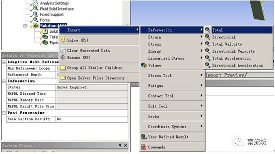 (9)右键选择Solution,分别单击Insert->Deformation->Total和Insert->Strain->Equivalent作为计算输出变量。
