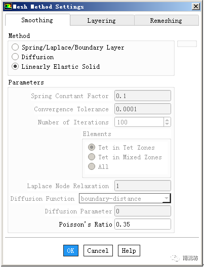 在Smoothing选项卡中,Method选择Linearly Elastic Solid,Passion’s Ratio填入0.35。