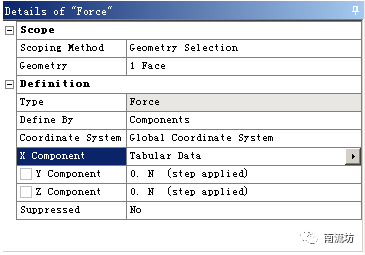 (8)在工具栏单击Loads->Force,选择下方固体域中的一个受力面。在X Component中设置随时间变化的周期性力。