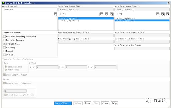 (2)单击Manual Create按钮弹出Create/Edit Mesh Interfaces对话框,选择contact_region-src和contact_region-trg,勾选 Coupled Wall,创建interface。