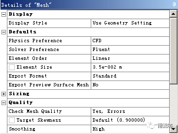 (5)设置网格尺寸为3.5e-2m。在Quality中,Smoothing选择High。