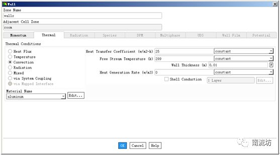 (2)在边界条件面板中,双击设置walls,在Thermal选项卡中,Thermal Conditions选择Convection,Heat Transfer Coefficient填入25,Free Stream Temperature输入299,Wall Thickness输入0.01,单击OK按钮确认退出。
