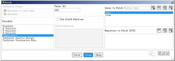 (2)在Solution Initialization(初始化设置)面板中,单击Patch按钮,弹出Patch对话框,在Zone to Patch中选择cube,Variable中选择Temperature,在Value中填入450,单击Patch按钮。