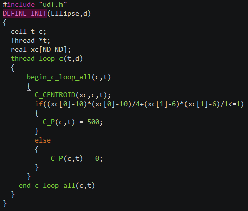 例如要定义一个中心在[10,6],长轴2m,短轴1m的椭圆,初始压力为500Pa,则可以使用以下UDF宏文件。