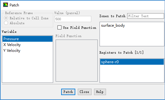 如图5-18所示,前面标记的区域出现在Registers to Patch列表中,可以选择此区域,并设置要Patch的值,图中Patch该区域的压力为500Pa,点击Patch按钮即可对该标记的区域进行初始化。