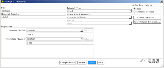 (2)单击主菜单中Setting Up Physics→Materials→Create/Edit,弹出Create/Edit Materials(材料)对话框。单击Fluent Database按钮弹出Fluent Database Materials对话框,选择water liquid和glycerin,单击Copy按钮确认。