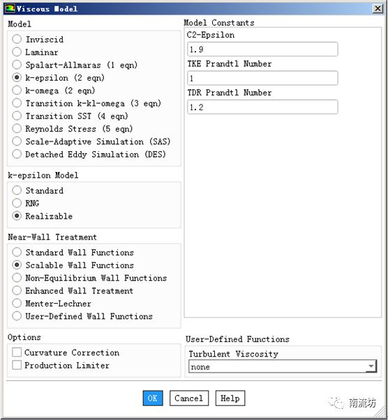 (5)在模型设定面板Models中双击Viscous按钮,弹出Viscous Model(湍流模型)对话框,在Model中选择Realizable k-epsilon(2eqn),在Near-Wall Treatment中选择Scalable Wall Functions,单击OK按钮确认并关闭对话框。