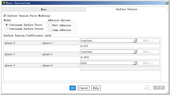 (4)在Phase设定对话框中,双击Interaction按钮,弹出Phase Interaction对话框,在Surface Tension选项卡中,勾选Surface Tension Force Modeling,在Adhesion Options中选择Wall Adhesion,对应不同的项输入不同的Surface Tension Coefficients,Phase-1与Phase-2输入0.072,Phase-1与Phase-3输入0.0631。