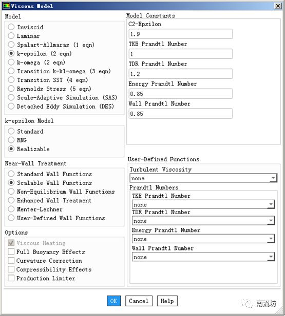 (3)在模型设定面板Models中双击Viscous按钮,弹出Viscous Model(湍流模型)对话框,在Model中选择Realizable k-epsilon(2eqn),在Near-Wall Treatment中选择Scalable Wall Functions,单击OK按钮确认并关闭对话框。