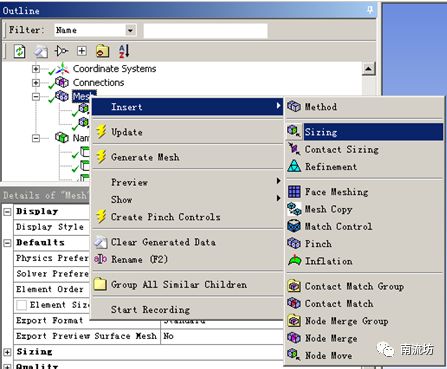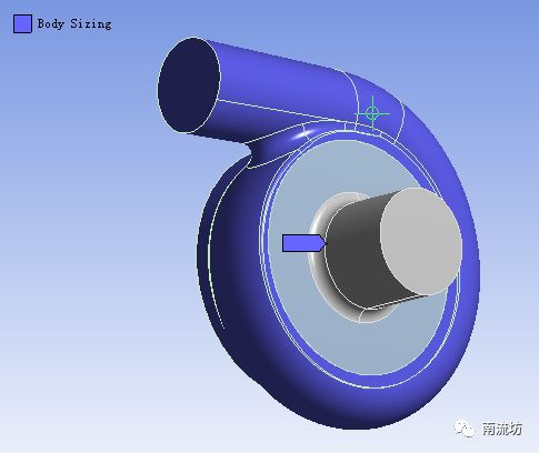 (3)右键单击模型树中Mesh选项,依次选择Mesh→Insert→Sizing。在Geometry中选择计算域中泵体区域,在Element Size中输入3e-3。